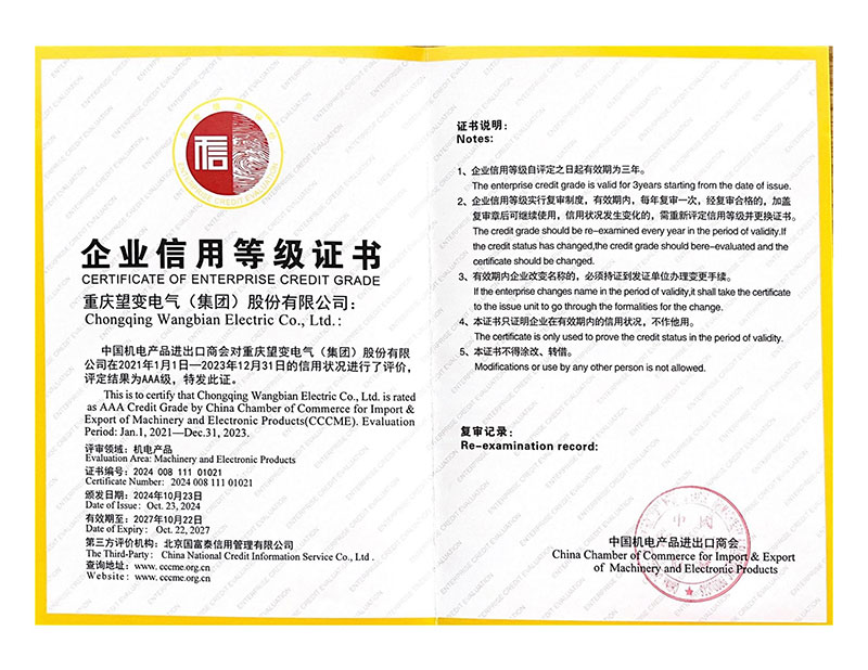 近日,中国机电产品进出口商会(CCCME)公布了2024年度企业信用等级评价结果,重庆望变电气(集团)股份有限公司获评AAA级信用等级。CCCME作为我国机电产品进出口行业唯一的全国性商会,企业信用等级评价共分为三等九...